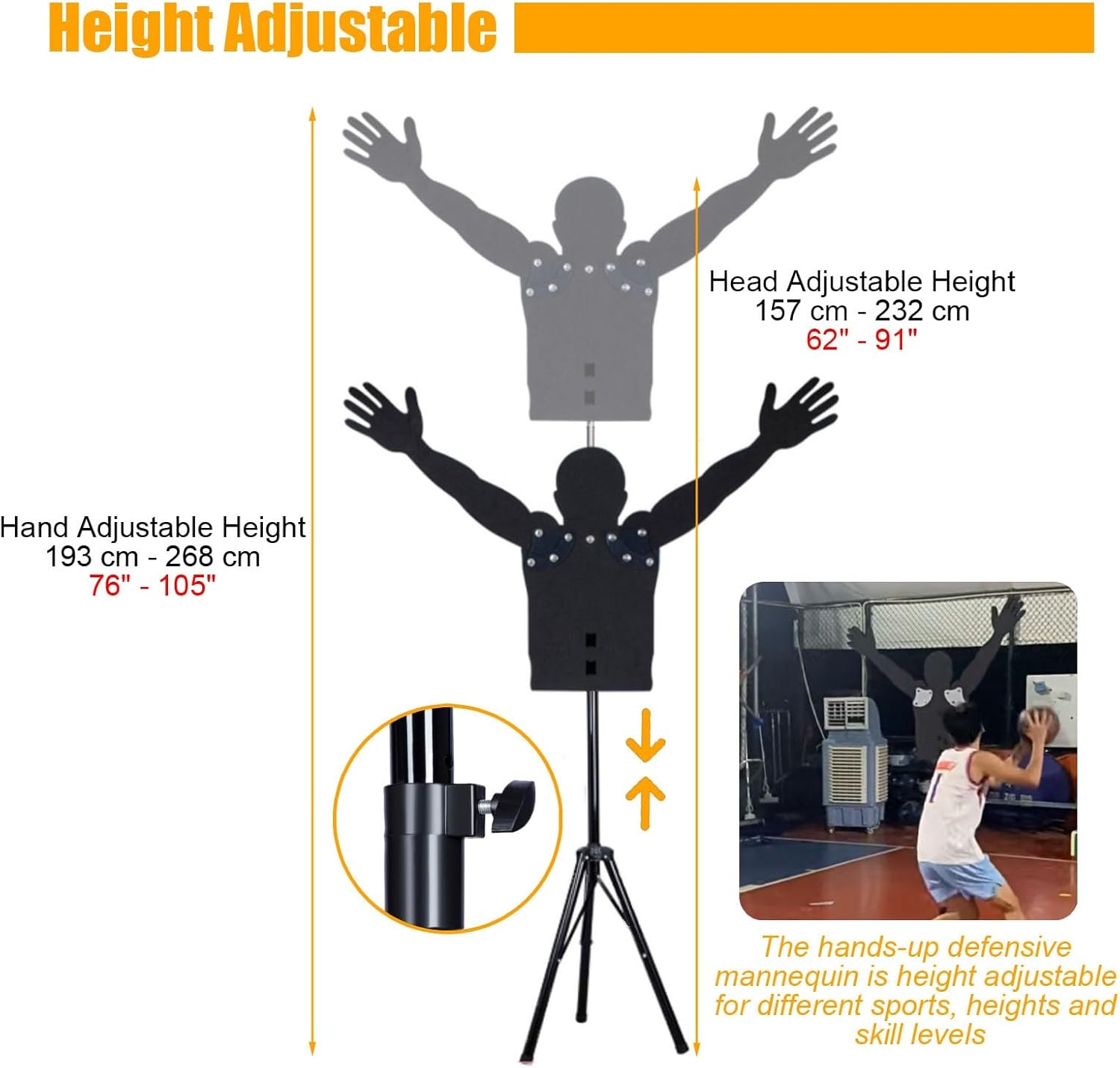 ? Basketball defensive mannequins visualize your opponents for a realistic training experience, practice arc shooting, dribbling, layups, and overall handling to take your skills from good to great! ? Specification - Material: Sponge + Stainless Steel Tube + PE Plastic - Weight: 3.43kg (7.5lbs) - Color: Black - Large Hand adjustable height: 208 cm - 283 cm ( 82" - 111" ) - Large Head adjustable height: 165 cm - 240 cm ( 65" - 94" ) - Small Hand adjustable height: 193 cm - 268 cm ( 76" - 105" ) - Small Head adjustable height: 157 cm - 232 cm ( 62" - 91" ) ? Feature - Adjustable height. - Adjustable hands up defence. - Easy to assemble and disassemble. - You can practice without a partner. - Easy to carry and practice anywhere. - The bottom is stable and not easy to fall down. - For teams and players of all abilities. ? Package Contents - 1 × Basketball Defender Dummy ? Warm Tips - If a slight odor is normal,it will disappear within two to three days. - Due to the different monitors and lighting, there may be some color difference between the picture and the product. - Due to manual measurement, there is a 1-2 cm error, specific to the actual size shall prevail. ? After-sales Service - If you have any questions about monitor stand, please do not hesitate to contact us, we provide 24-hour customer service.