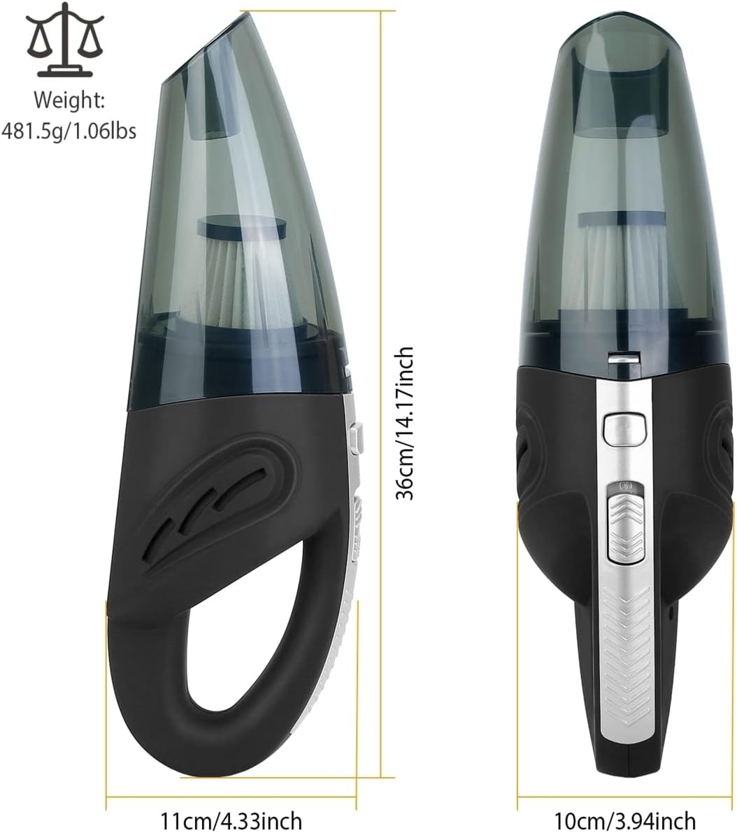 Have you ever troubled by food or drink split in your car? Have you struggled to remove the annoying pet hair on the seat? Our iNova car vacuum can resolve your problems. Featuring stylish design and powerful suction our handheld portable vacuum is a versatile helper that quickly tackles mess and dirtiness in the car. No more worrying about the dust pet hair or split water in your car. It is a great choice for taxi/Uber/Lyft drivers who want to keep a clean car for passengers and other car owners for general routine vacuuming.Features4800PA Cyclonic Powerful Suction: iNova car vacuum features with 120W power motor and offers 4800 PA cyclonic suction which can suck up the dust pet hair crumbs and other small things in the car. Improved HEPA Filter: Our hand vacuum cleaner boasts an enhanced HEPA filter and multi-stage filter system which helps to further extend the lifetime and effectively avoid clog of filters. Exquisite workmanship with notable durability provides you unparalleled user experience. Multi-functional & All-Round Cleaning: This handheld vacuum provides deep cleaning for your house and car helping you clean the dust in sofas walls stairs and other hard-to-reach areas with 3 accessories (Brush Hose Crevice Nozzle). The brush can be used to clean human and pet hair and the dirty stick. The soft long hose can be used to clean the surface of leather without damage. The long mouth can be used to capture the debris at a narrow corner or space. Wet & Dry Use: Support dry and wet use quickly absorb the spilled liquid (except corrosive flammable and explosive liquid) pet hair and debris even they fall into the hard-to-reach area in the car with the included external 13cm/ 5.12inch long suction nozzle. Cordless & Washable: This cordless hand vacuum is lightweight and portable enough to help you clean everywhere at home or in your car. Moreover the HEPA filter in the vacuum is removable and washable. NOTE: Forbid abs
