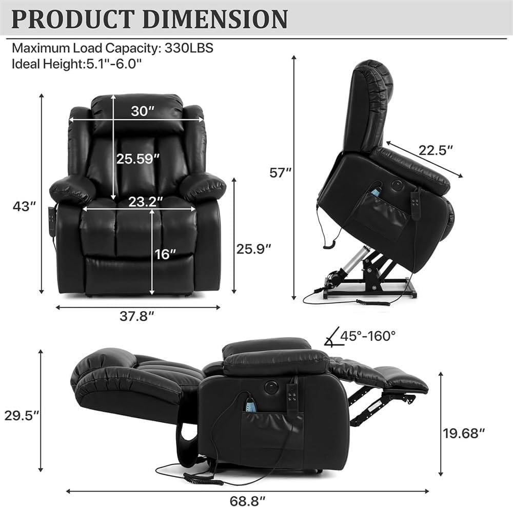 Specifications:Name: Massage ChairApplicable Location: Living Room, Office, LoungeMaterial: Leather*We use wood and Premium upgraded breathable fabric, ensure long-lasting durability.*The fabric is easy to clean and offers breathability and comfort and durability.*Easily customizable 45°, it is suitable for all ages and helps the elderly to stand up easily.*Ideal for people with leg, back problems or limited mobility.Package ListChair*1