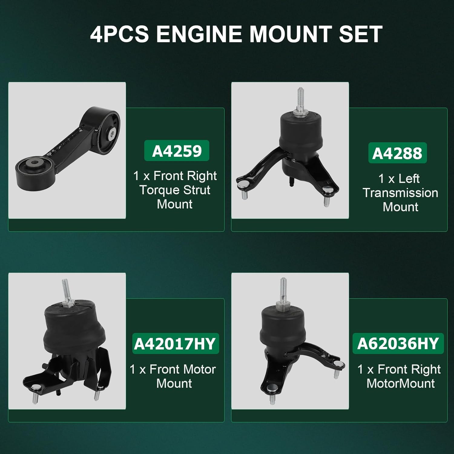 | Included Components | Engine Motor Mount Transmission Mount and Torque Strut Mount Set |