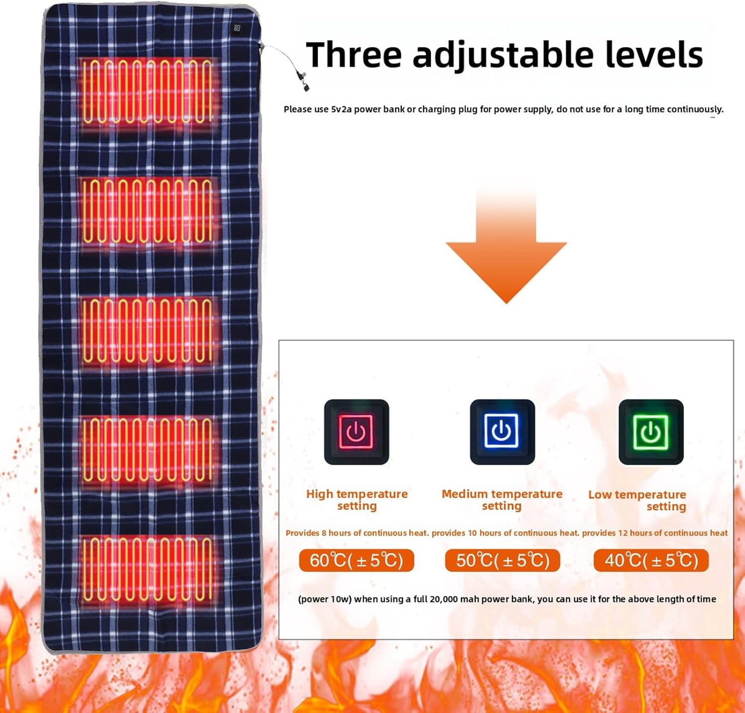 Specification: Item Type: USB Heated Pad Material: Crystal Velvet Weight: Approx. 776.00g / 27.37oz Product Size: Approx. 180x60cm / 70.87x23.62in Power: 10W How to Use: Connect to power directly to use Package List: 1 x USB Heated Pad 1 x Storage Bag 1 x Instruction Manual Notice: Use 2A power bank or charger to supply power, do not use continuously for a long time. Power 10W. When using a full 20000mAh power bank, you can use it for the above duration.